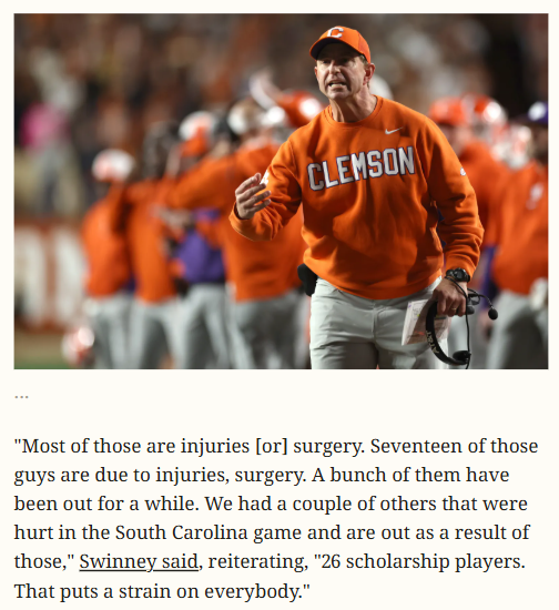 Jay Williams+FollowTigers’ Depth Tested vs Nittany LionsDabo’s Tigers are heading to the Pinstripe Bowl with a seriously depleted roster—26 scholarship players out, including key starters and several hitting the transfer portal. King Dabo says it’s “next man up” as Clemson faces a Penn State squad fresh off a coaching shakeup. Can the Tigers’ backups step up in Yankee Stadium, or will the Nittany Lions pounce on the opportunity? This matchup just got a lot more intriguing for both fanbases! #Sports #Football #ClemsonTigers00Share