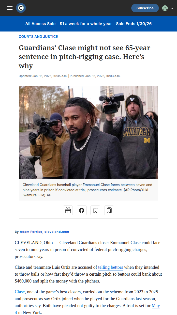 Tammy Sellers+FollowWhy Clase likely won’t get 65 years in prisonFederal charges against Guardians pitcher Emmanuel Clase sound huge—he technically faces up to 65 years for alleged pitch-rigging—but the real story is that experts say he’d likely serve much less if convicted. Federal sentencing guidelines usually lead to sentences between 7 and 9 years, factoring in things like cooperation, prior record, and the actual harm done. Maximum sentences are almost never handed out. The case shines a light on how complicated and nuanced federal sentencing really is. What do you think—should guidelines matter more than maximums? #Sports #Baseball #ClevelandGuardians00Share