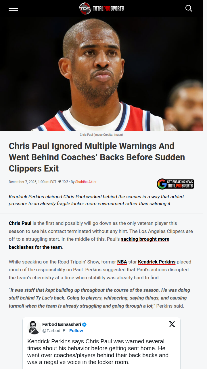 Nicole Obrien+FollowPoint God Drama: CP3’s Clippers FalloutWow, Clippers Nation, what a wild ride with CP3! The Point God’s sudden exit has everyone talking. Kendrick Perkins spilled some serious tea, blaming Chris Paul for stirring up locker room drama and ignoring Ty Lue’s leadership. Even The Beard and The Klaw weren’t feeling his vibe. With the Clips already struggling, was CP3’s influence the final straw? Where do you think Paul lands next—and can he bounce back? #Sports #Basketball #Clippers20Share