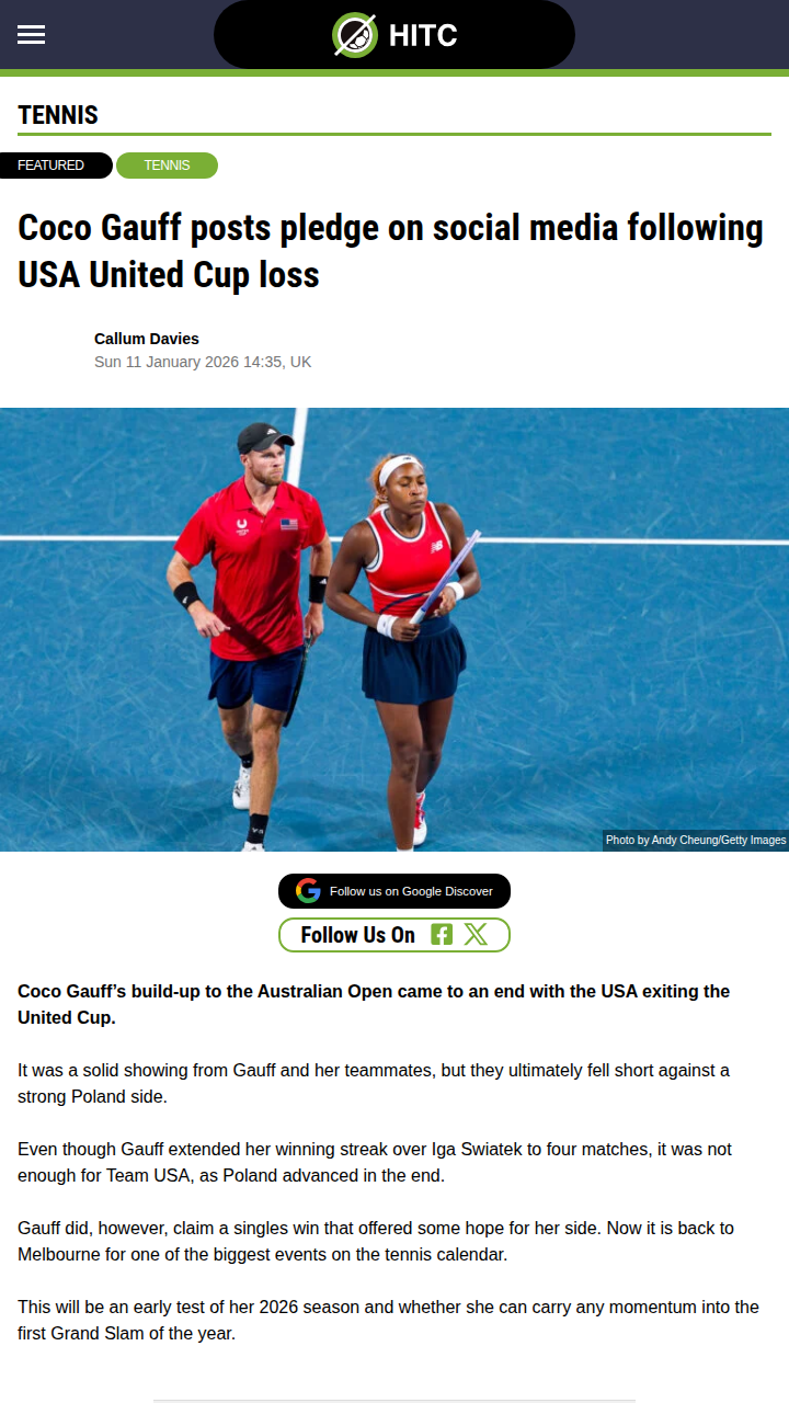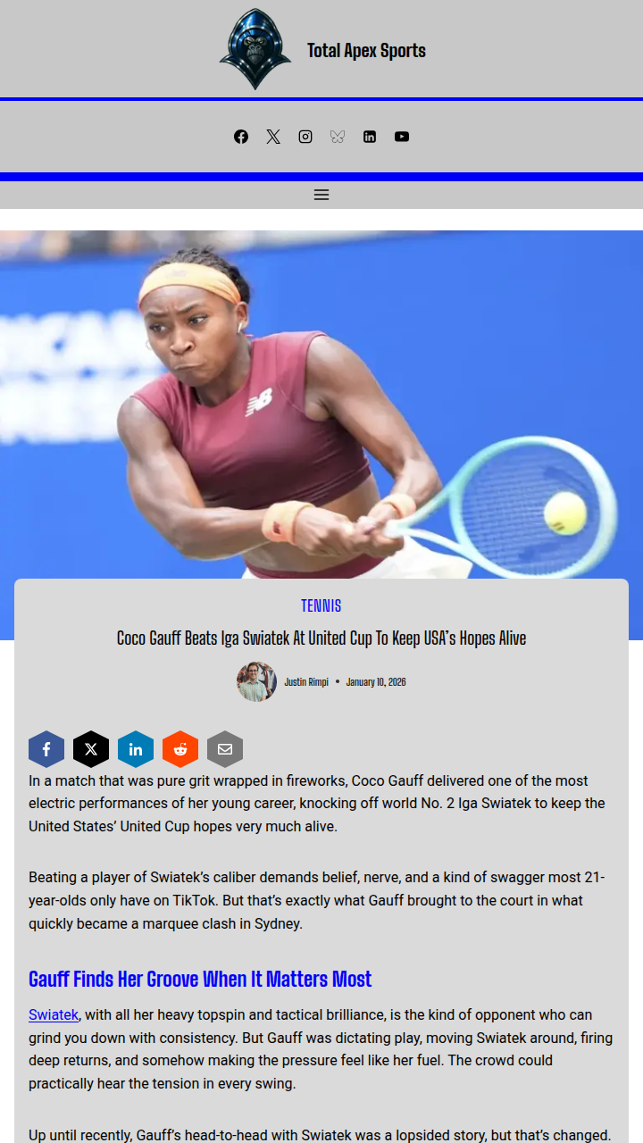 Reginald Gonzalez+FollowGauff vs Swiatek: Rivalry Heats Up at United CupCoco Gauff may not have carried Team USA past Poland in the United Cup, but her fourth straight win over World No. 1 Iga Swiatek is turning heads. Even though the Stars and Stripes are out, Gauff’s message to fans shows she’s hungry for more—and her rivalry with Swiatek is suddenly looking a lot more even. Can she keep this momentum rolling into Melbourne? #Sports #Tennis #CocoGauff00Share