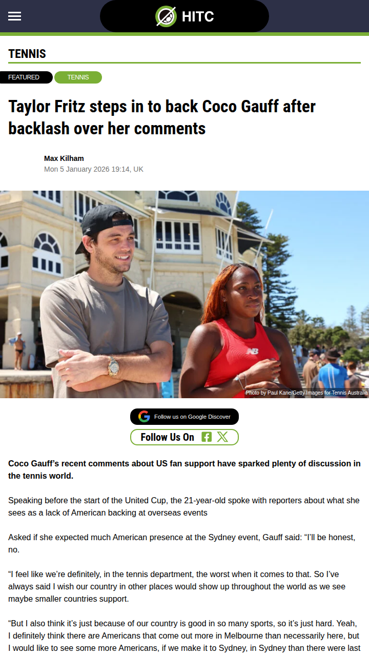 Gregory Costa+FollowFritz Defends Gauff After Fan Support Flare-UpBig serve from Taylor Fritz! After Coco Gauff’s honest take on American fan support overseas got twisted, Fritz jumped in to set the record straight. He was right there when Gauff made her comments at the United Cup, and says it’s not about loyalty—just a difference in sports culture. Love seeing Fritz back up his teammate, especially with both battling on and off the court. What do you think: Are US fans really less visible abroad, or is this just media noise? #Sports #Tennis #CocoGauff10Share