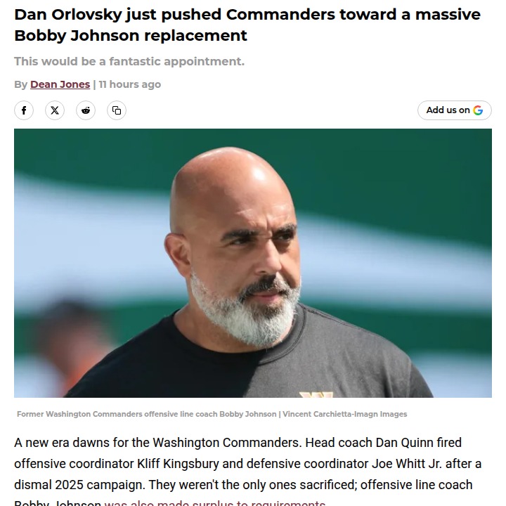 Amy Williams+FollowOrlovsky Wants Ledford for Commanders O-LineBig shakeup in D.C.! After a rough season, Coach Quinn cleaned house, and now Dan Orlovsky is calling for the Commanders to go all-in on Dwayne Ledford as Bobby Johnson’s replacement. Ledford’s run game magic in Atlanta could be just what the Hogs need to get back on track. But will Washington move fast enough to land him before someone else does? This next hire could make or break Quinn’s tenure. Thoughts, Commanders fans? #Sports #Football #Commanders00Share