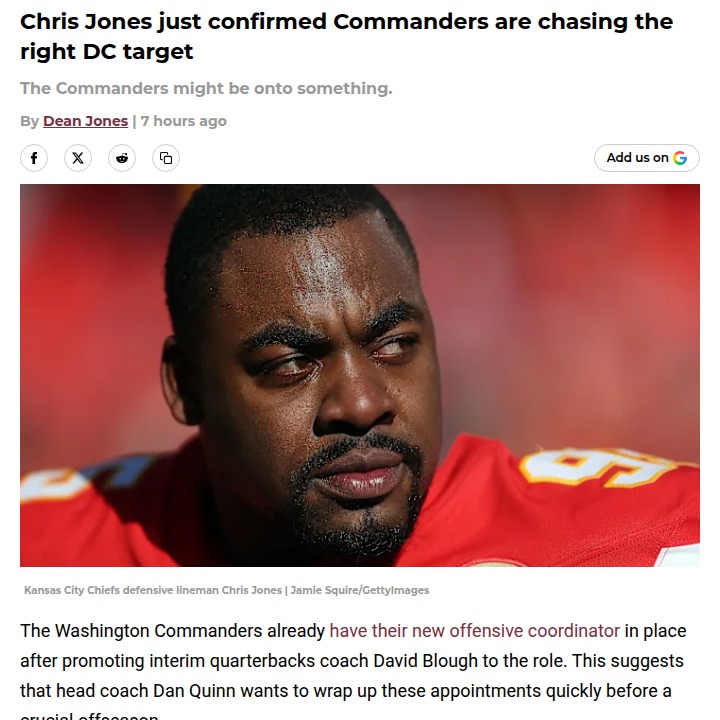 Jay Williams+FollowCommanders eye Chiefs’ Joe Cullen for DC roleChris Jones’ reaction says it all—Washington might be on the verge of a game-changing hire. The Commanders are seriously considering Chiefs defensive line coach Joe Cullen for their defensive coordinator spot, and Jones, a star in Kansas City, is clearly not thrilled about the possibility of losing him. Cullen’s reputation for building tough, disruptive defenses could be exactly what Washington needs after a rough season. With Dan Quinn moving fast on staff changes, do you think Cullen is the right fit to turn the Commanders’ defense around? Who else would you want to see in the mix? #Sports #Football #Commanders10Share