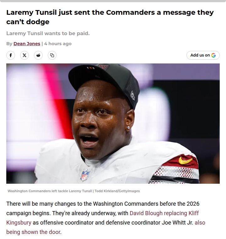 Aaron Taylor+FollowLaremy Tunsil’s contract call shakes up CommandersLaremy Tunsil isn’t waiting around—he’s made it clear to the Commanders: pay up or risk losing your franchise left tackle. After a standout season, Tunsil hopped on Instagram to remind Washington’s front office he expects to be the NFL’s highest-paid at his position, with numbers around $30 million a year being floated. With so much change already hitting the Commanders, locking down Tunsil feels like a no-brainer. Do you think the team should break the bank to keep him, or is it too risky to invest that much in one player? Let’s hear your take! #Sports #Football #Commanders20Share