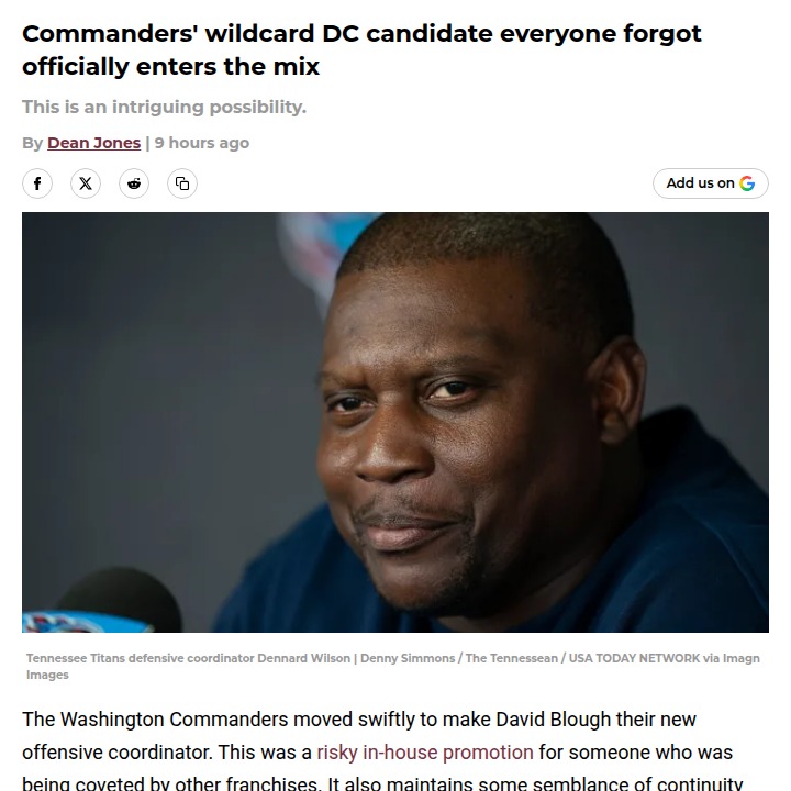 Chad Williams+FollowWildcard DC candidate shakes up Commanders searchDennard Wilson, a Maryland native with a knack for developing young defensive talent, just got an interview for the Washington Commanders’ defensive coordinator job. Wilson’s rise with the Titans, despite limited resources, has caught the eye of many. His local roots and experience with teams like the Jets, Rams, Eagles, and Ravens make him a fresh, intriguing option. Fans are buzzing about whether his progressive approach could finally spark the defensive overhaul Washington desperately needs. What do you think—should the Commanders take a chance on Wilson, or keep looking for a bigger name? #Sports #Football #Commanders00Share