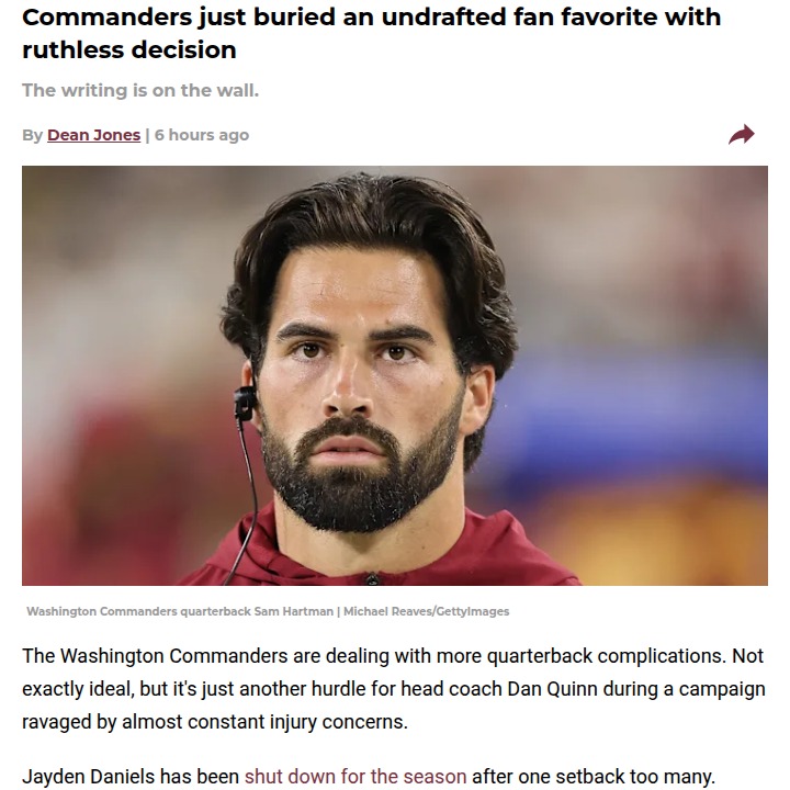 Aaron Taylor+FollowWashington Commanders’ QB shakeup leaves fans stunnedWashington’s quarterback carousel just took another wild turn. With Jayden Daniels out for the season and Marcus Mariota’s status up in the air, the Commanders have brought back Jeff Driskel instead of giving undrafted fan favorite Sam Hartman a shot. This move speaks volumes about how the coaching staff views Hartman’s progress—and it’s not great. Despite his strong bond with Daniels, Hartman’s chances of seeing the field (or even sticking around next season) look slimmer than ever. Is this the right call for a team playing only for pride? What would you do in their shoes? #Sports #Football #Commanders160Share
