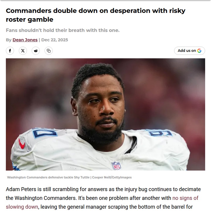 Jay Williams+FollowCommanders’ wild roster shakeup: Will it work?Washington’s front office is pulling out all the stops after a brutal wave of injuries, grabbing Shy Tuttle off waivers in a last-ditch effort to patch up the defense. Tuttle’s recent track record isn’t exactly inspiring—he struggled with the Panthers and Titans, and now he’s being asked to step up for the Commanders. With nothing left to lose this season, it’s a bold move that could go either way. Do you think this gamble will pay off, or is it just another sign of a team in trouble? Let’s hear your take! #Sports #Football #Commanders00Share