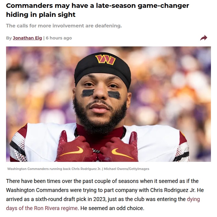 Amy Williams+FollowCommanders’ surprise spark: Chris Rodriguez Jr.Chris Rodriguez Jr. has quietly become the Washington Commanders’ go-to running back, defying the odds after nearly being cut multiple times. Despite a crowded backfield and a rocky start, Rodriguez’s hard-nosed running style and consistency have given the struggling offense a much-needed boost. Over the last six games, he’s averaged 4.7 yards per carry and found the end zone three times. With the passing game faltering and injuries piling up, Rodriguez’s emergence could be the game-changer Washington needs. What do you think—should the Commanders keep riding Rodriguez as their lead back, or look for more explosive options? #Sports #Football #Commanders00Share