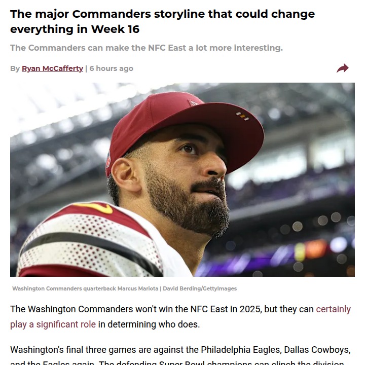 Michael Pitts+FollowCommanders Could Flip NFC East ScriptDon’t sleep on the Commanders down the stretch! With nothing to lose, Washington’s squad is primed to play spoiler against their biggest rivals. If they upset the Eagles this week, the NFC East race could get wild, especially with the Cowboys lurking. Dan Quinn’s crew has momentum and pride on the line—could they end Philly or Dallas’ playoff dreams? This rivalry is about to get spicy! #Sports #Football #Commanders31Share