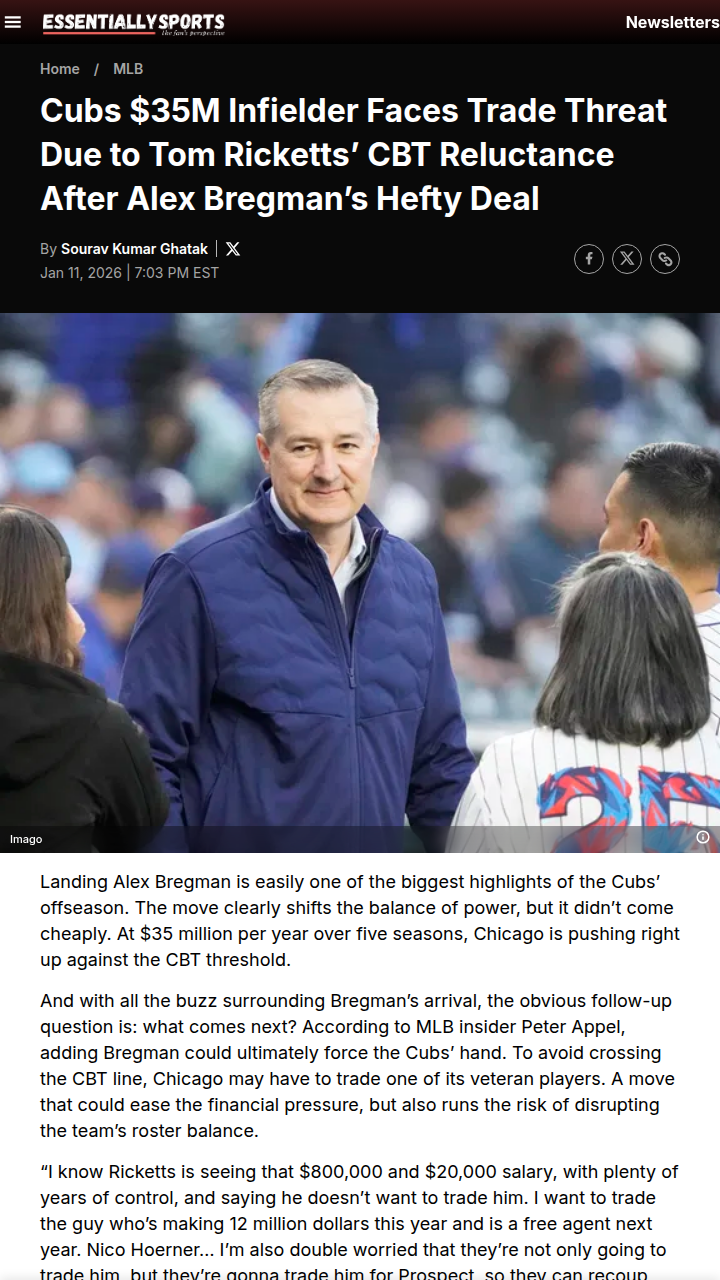 Kimberly Moore+FollowCubs’ $35M Infield Dilemma After Bregman DealBig shakeup on the North Side! The Cubs’ blockbuster Alex Bregman signing has fans buzzing, but it’s got the front office sweating the CBT line. Now, Gold Glover Nico Hoerner’s name is swirling in trade rumors—especially with Matt Shaw waiting in the wings. Would moving Hoerner for prospects (maybe to the Yankees?) be worth losing his elite defense and contact bat? Or is keeping both him and Bregman the real power move? #Sports #Baseball #Cubs10Share