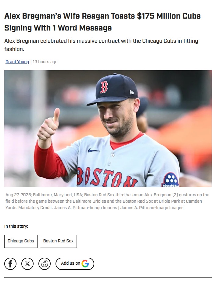 Cassandra Reed+FollowBregman Joins Cubs: Reagan’s 1-Word ToastCubs fans, it’s official—Breggy Bomb is headed to Wrigley! The North Siders just locked in Alex Bregman with a $175M deal, making it the third biggest contract in team history. Reagan Bregman’s proud Insta toast says it all. With Bregman in the infield, will Chicago move Nico Hoerner? Either way, the Cubs are making serious moves this offseason. Thoughts on the new rivalry brewing in the NL Central? #Sports #Baseball #Cubs10Share