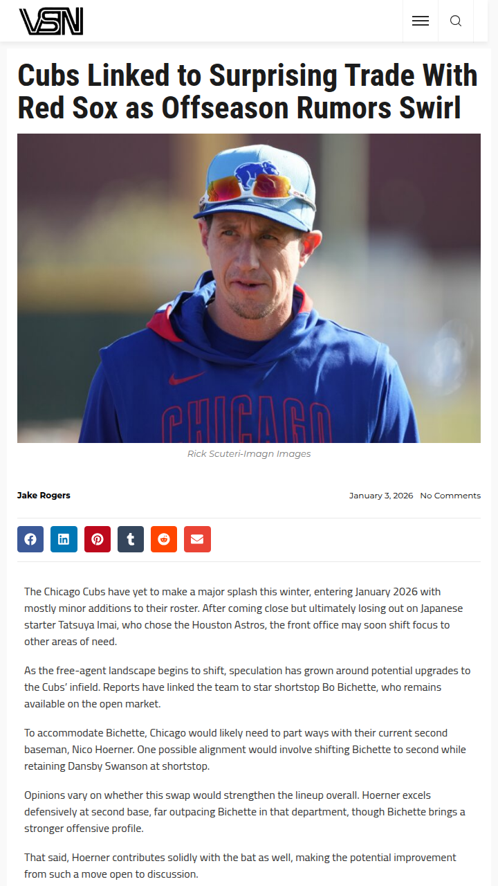 Kimberly Moore+FollowCubs-Red Sox: Hoerner Trade Buzz Heating UpRumors are swirling about a potential blockbuster move: the Cubs might send their defensive wizard Nico Hoerner to the Red Sox, possibly to make room for Bo Bichette. While Hoerner’s glove is gold, Bichette’s bat could add serious pop to the lineup. Would the Cubs regret losing a cornerstone, or is this the spark they need? Fenway’s Green Monster could turn Hoerner into a doubles machine if he lands in Boston. Let’s hear your takes—would you pull the trigger on this trade? #Sports #Baseball #Cubs10Share