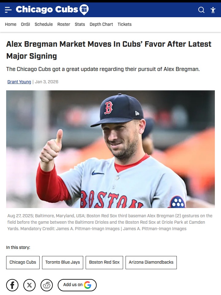 Timothy Huff MD+FollowBregman Buzz: Cubs Losing Ground?Looks like the Bregman-to-Cubs dream might be fading, folks. While many of us thought the North Siders would make a big push for the Astros’ star third baseman, MLB insiders say the Blue Jays and D-backs are way more aggressive in the chase. If Jed Hoyer doesn’t step up, we could see the Cubs miss out on a premier bat—especially tough after losing Kyle Tucker. Should the front office pivot to pitching, or is it Bregman-or-bust? #Sports #Baseball #Cubs01Share
