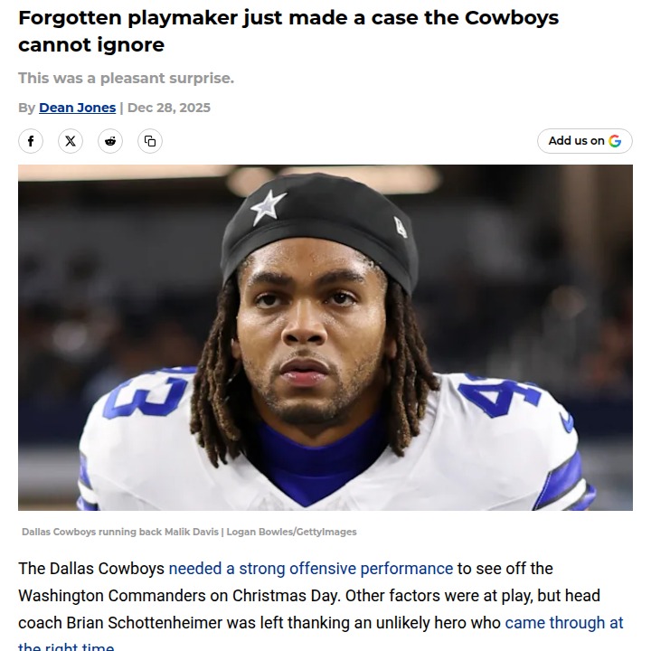 phughes+FollowMalik Davis shines in Cowboys’ big winMalik Davis just turned heads in Dallas with a breakout performance against Washington, racking up 103 yards on only 11 carries. With Javonte Williams sidelined, Davis stepped up and showed the kind of explosive running the Cowboys have been missing. Now, with the playoffs out of reach, it’s the perfect time for Dallas to see what Davis can do with a bigger role. Should the Cowboys give him the keys for the season finale? Fans are buzzing about what this could mean for next year’s backfield. Let’s hear your thoughts—does Davis deserve more carries? #Sports #Football #DallasCowboys10Share