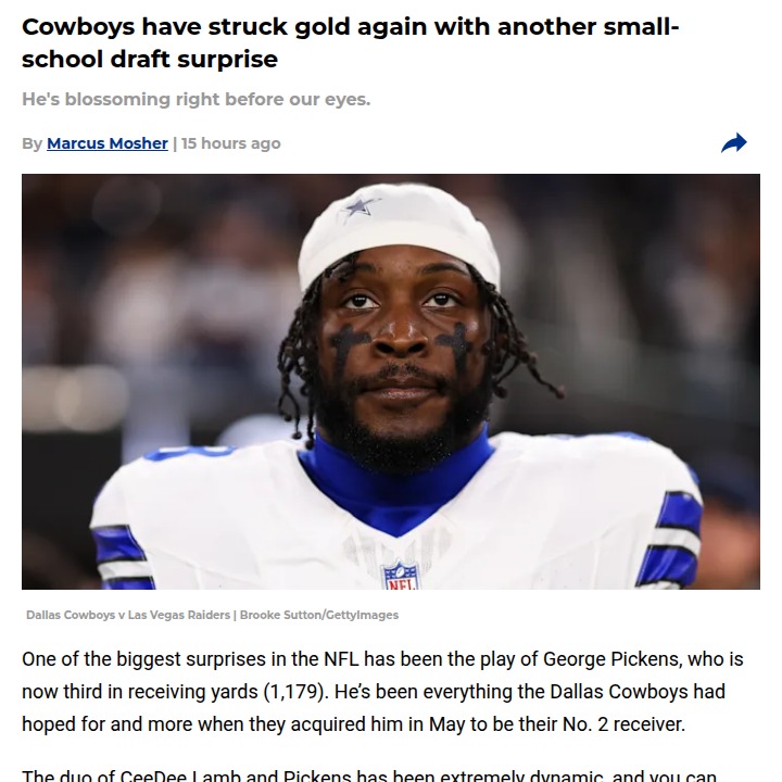 Michael Pitts+FollowPickens Drama: Cowboys Fans, Let’s TalkCowboys Nation, what do you make of the George Pickens debate after that Lions loss? Alex Smith just dropped some serious knowledge on ESPN, saying Pickens was doubled all night, opening up CeeDee and Flournoy for big games. Sure, his stats were quiet, but Smith says he played the decoy perfectly. Do you buy that, or do you expect more from our new WR1? Let’s hear your takes! #Sports #Football #DallasCowboys21Share