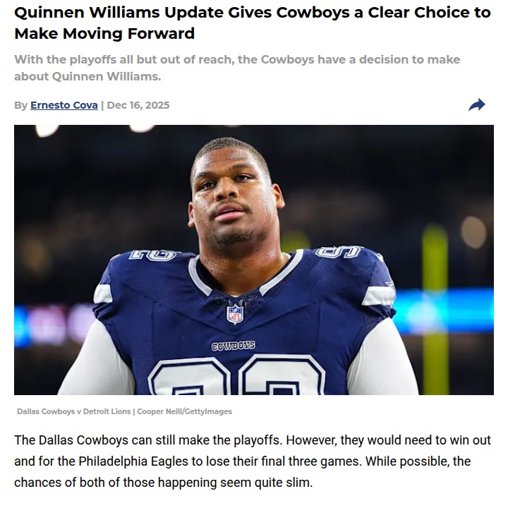 Amy Williams+FollowCowboys face tough call on Quinnen WilliamsLosing control of their playoff destiny, the Dallas Cowboys now have a big decision to make with Quinnen Williams. After suffering a concussion and already dealing with a shoulder issue, is it really worth risking his long-term health for a slim shot at the postseason? Williams has been a game-changer since joining, but with the odds stacked against Dallas, resting him could be the smarter move. What do you think—should the Cowboys play it safe and look ahead to next season, or go all-in for a miracle run? #Sports #Football #DallasCowboys00Share
