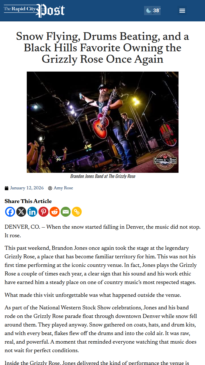 charles39+FollowSnow and music light up Denver streetsWatching Brandon Jones and his band play right through a Denver snowstorm—on a parade float, no less—was one of those moments that just sticks with you. The Grizzly Rose is already a legendary spot for country music, but seeing one of our own from the Black Hills keep the beat as snowflakes flew off the drums? That’s pride, grit, and a reminder that real music doesn’t wait for perfect weather. Jones isn’t just a familiar voice on the radio—he’s out there, earning every stage. Who else has memories of concerts where the weather made it unforgettable? #Entertainment #Music #Denver00Share