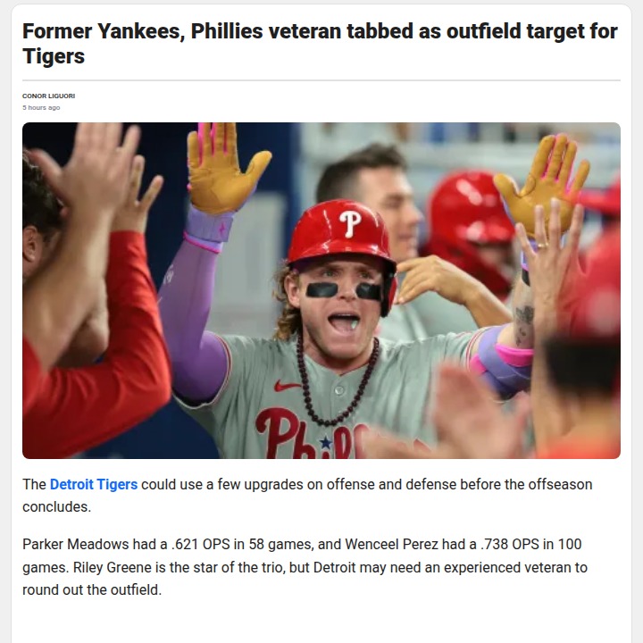 Tammy Sellers+FollowCould Harrison Bader boost the Tigers' outfield?Detroit’s outfield could look a lot different if the Tigers land veteran Harrison Bader. With Parker Meadows and Wenceel Perez still finding their footing, adding someone with Bader’s experience—especially after his strong finish with the Phillies—could be a game-changer. He’s proven he can handle center field and hit right-handed pitching well, which might take some pressure off the younger guys and give Detroit more options if injuries pop up. What do you think—should the Tigers go after Bader, or stick with their young core? #Sports #Baseball #DetroitTigers10Share