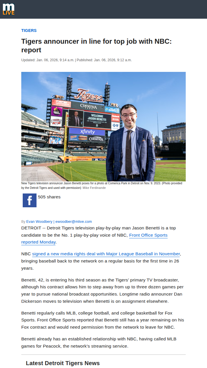 jharvey+FollowDetroit’s Jason Benetti eyed for NBC’s top spotLongtime Detroit Tigers fans could soon see a familiar face on national TV—Jason Benetti is reportedly in the running to become NBC’s lead play-by-play announcer. This would be a huge leap from calling Tigers games to reaching millions across the country. Benetti’s unique style and deep baseball knowledge have made him a local favorite, so it’s no surprise he’s catching national attention. What do you think—would you miss his voice on Tigers broadcasts, or are you excited to see him take on a bigger stage? #Sports #DetroitTigers #JasonBenetti00Share