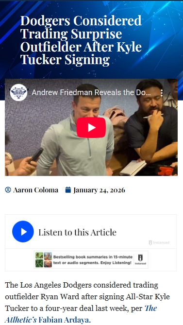 Timothy Huff MD+FollowDodgers Outfield Shakeup: Ward's Uncertain FutureDodger Nation, what do you make of the front office nearly flipping Ryan Ward after landing Kyle Tucker? With King Tuck now patrolling the outfield, Ward—last year’s Triple-A MVP—suddenly finds himself fighting for a roster spot. The brass moved Siani instead, but Ward’s MLB debut is still up in the air. If he crushes it in spring, could he force his way onto the Opening Day squad? Let’s hear your takes! #Sports #Baseball #Dodgers00Share