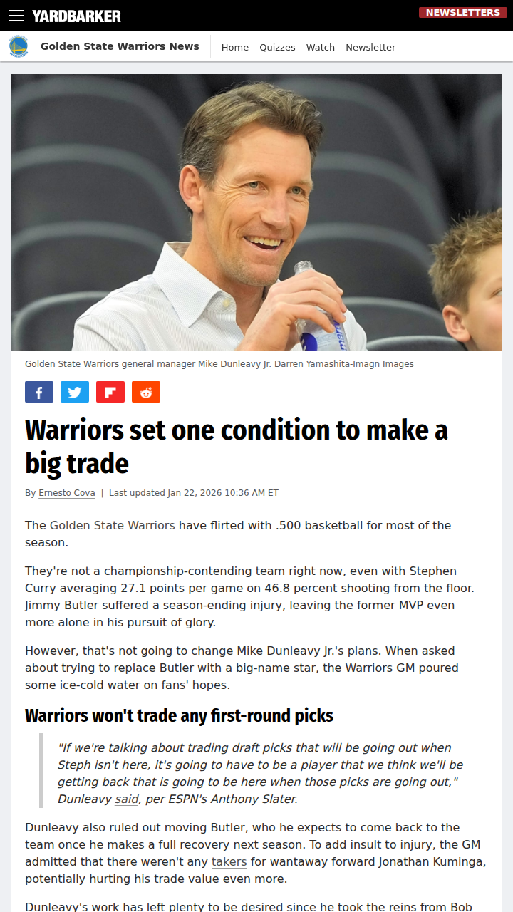 Patrick Gonzales+FollowWarriors GM Dunleavy Roasts Kuminga Trade TalkMike Dunleavy just gave Warriors fans a reason to cheer—he pulled no punches on JK’s trade request, basically telling the league there’s zero market for the young forward. After being benched for weeks, Kuminga’s numbers haven’t convinced anyone, and Dunleavy’s icy response made it clear: the Dubs won’t give him away for nothing. With the deadline looming, will anyone bite, or is JK stuck in the Bay? #Sports #Basketball #DubNation00Share