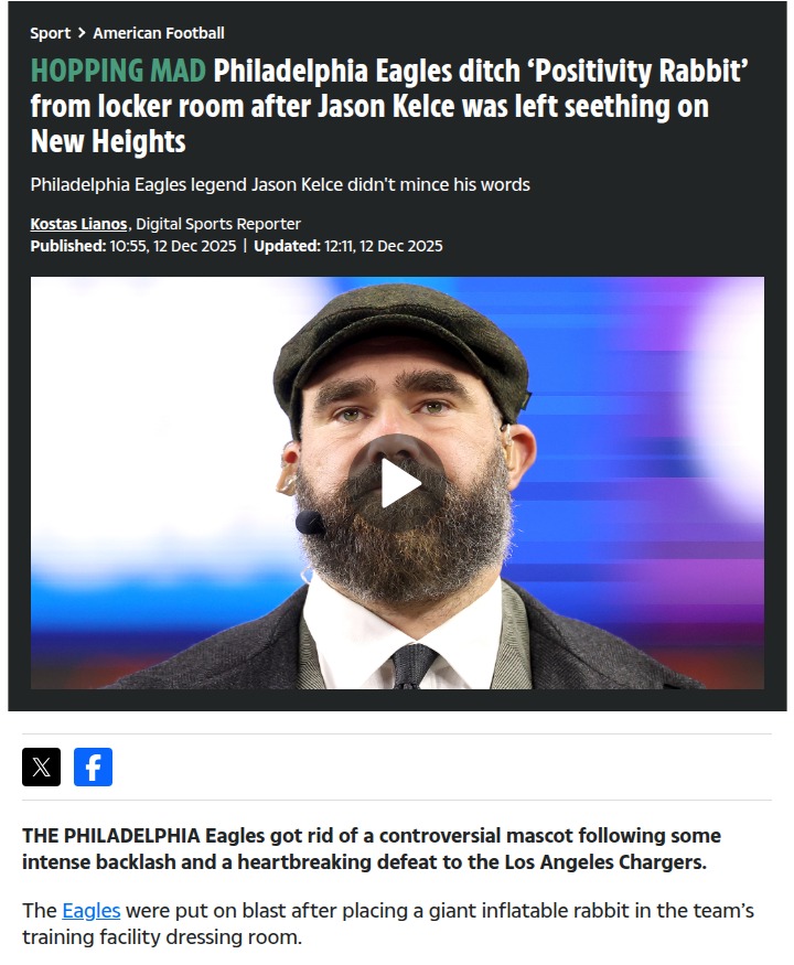 Aaron Taylor+FollowEagles drop 'Positivity Rabbit' after locker room dramaThe Eagles just pulled the plug on their infamous 'Positivity Rabbit' after it sparked more eye rolls than team spirit in the locker room. Players and fans weren’t having it, especially after a tough loss to the Chargers. Jason Kelce didn’t hold back on his podcast, calling the whole rabbit idea a total flop. With Philly still leading the NFC East, the focus is back on football, not inflatable mascots. What do you think—do quirky locker room gimmicks help or hurt a team’s vibe? #Sports #Football #Eagles00Share