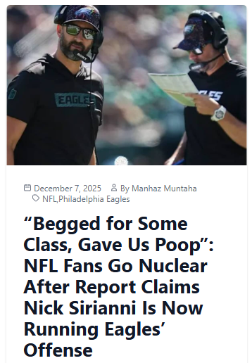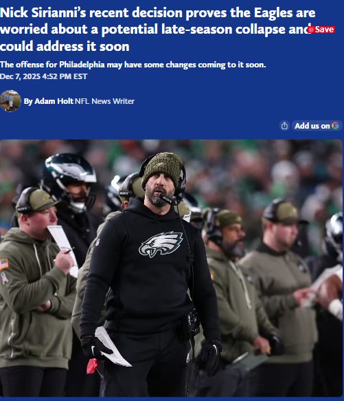 Jeffrey Armstrong+FollowEagles fans furious as Sirianni takes over offenseNick Sirianni stepping in to run the Eagles’ offense has Philly fans absolutely fuming. After weeks of ugly performances, folks wanted a shakeup—but not this one. Social media is blowing up with reactions, with many calling this move a disaster and predicting even worse results against the Chargers. Some are even comparing this to his rough play-calling days in 2021. The frustration is real, especially with the team’s Super Bowl hopes fading. What do you think—can Sirianni turn things around, or is this just adding fuel to the fire? #Sports #Football #Eagles00Share