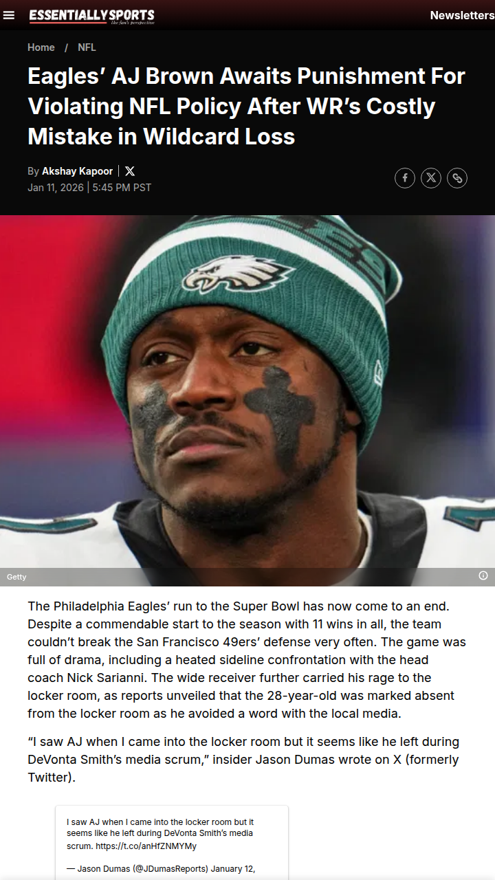 Christopher Hughes+FollowAJ Brown’s Wildcard Blunder: What’s Next?Tough night for the Birds as AJ “Always Open” Brown’s missed deep ball against the 49ers turned into the turning point of the Eagles’ season. That third-quarter play had fans on the edge, but the ball just slipped past his hands—costing Philly a shot at a comeback. Now, with AJ facing possible NFL discipline for his postgame actions, the offseason drama is just getting started. Was this just a bad break, or something deeper with the Eagles’ chemistry? #Sports #Football #EaglesNation12Share