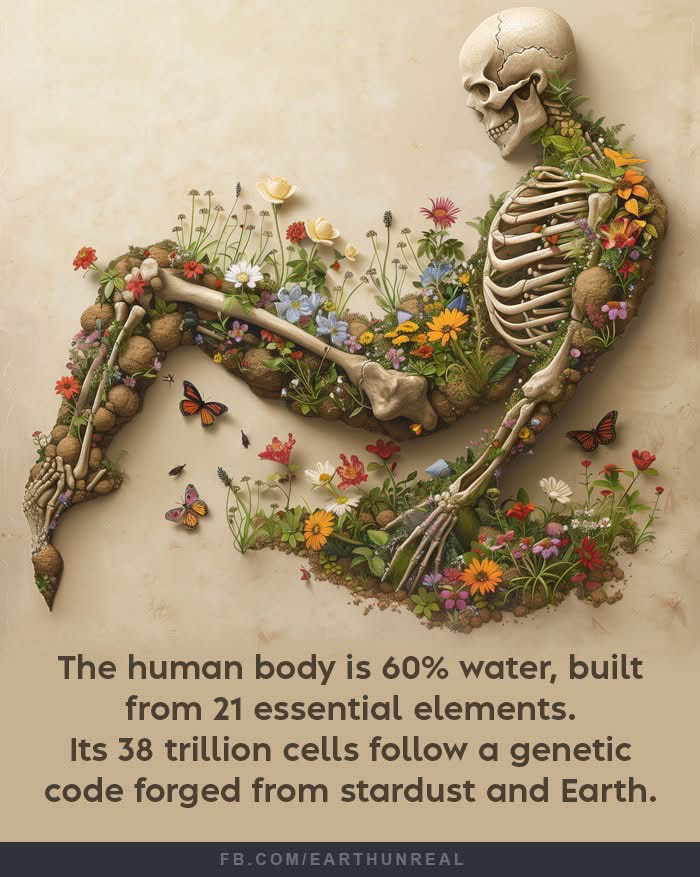 The human body is a precise and temporary assembly of the natural world. Roughly 60% of our body mass is water, and our tissues are built from about 20 to 21 chemical elements that account for nearly everything we are. Oxygen, carbon, hydrogen, nitrogen, calcium, phosphorus, and trace elements present in extremely small amounts. Together, they form an estimated 37 to 39 trillion cells, depending on body size and measurement method. These elements are tangible and traceable. Calcium cycles through rock, soil, and ancient oceans. Iron exists because of processes that occurred long before Earth took its present form. Oxygen continually moves between atmosphere, plants, and living organisms. DNA, the double helix found in nearly every cell, carries the biological instructions that guide growth, repair, and inheritance across generations. However one understands their ultimate origin, the materials that form the human body are drawn directly from the Earth and the wider universe. We are composed of the same matter that shapes forests, oceans, and stars, organized into life for a limited time, then returned to the world that formed us. - Earth Unreal #HumanBiology #NatureAndScience #WeAreNature #EarthScience #EvolutionaryBiology ----
