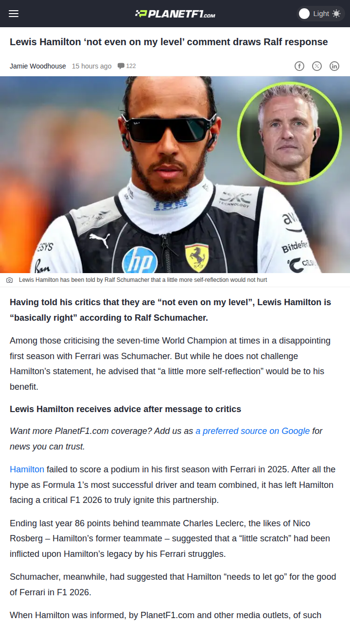 romankimberly+FollowHamilton vs Critics: Is King James Right?King Lewis fired back at his critics, saying they’re “not even on my level” after a tough debut season with the Prancing Horse. Ralf Schumacher, who’s been vocal about Hamilton’s struggles, actually agrees with the GOAT’s claim but suggests a bit more self-reflection wouldn’t hurt. With no podiums and Leclerc outpacing him, 2026 is shaping up as a redemption year for Hamilton and Ferrari. Can the new car formula reignite his legacy? #Sports #Racing #F100Share
