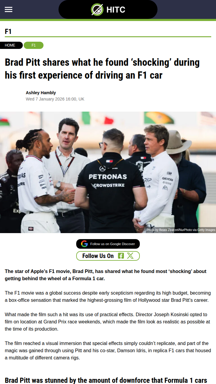 lisa79+FollowBrad Pitt’s F1 Shock: Downforce is Wild!Did anyone catch Brad Pitt’s reaction after driving an F1 car for his new movie? Even Hollywood’s finest was floored by the insane downforce these beasts generate. Pitt trained like a real racer, logging 6,000 miles and nearly hitting 200mph! Plus, props to Sir Lewis for making sure every Silverstone gear shift was spot-on. The realism in this film is next level, thanks to real track action and Hamilton’s input. #Sports #Racing #F100Share