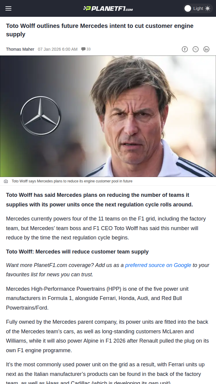 Jason Smith+FollowToto Wolff’s Power Play: Fewer Mercedes Engines?Big news from the Silver Arrows camp: Toto Wolff just hinted that Mercedes will cut back on supplying engines to customer teams after the next F1 regulation shakeup. With McLaren, Williams, and Alpine all running Merc power, this could seriously shake up the grid. Wolff even called McLaren the 'enemy in the house' after they outscored the works team! Could this be the end of Mercedes’ data-sharing era? #Sports #Racing #F100Share