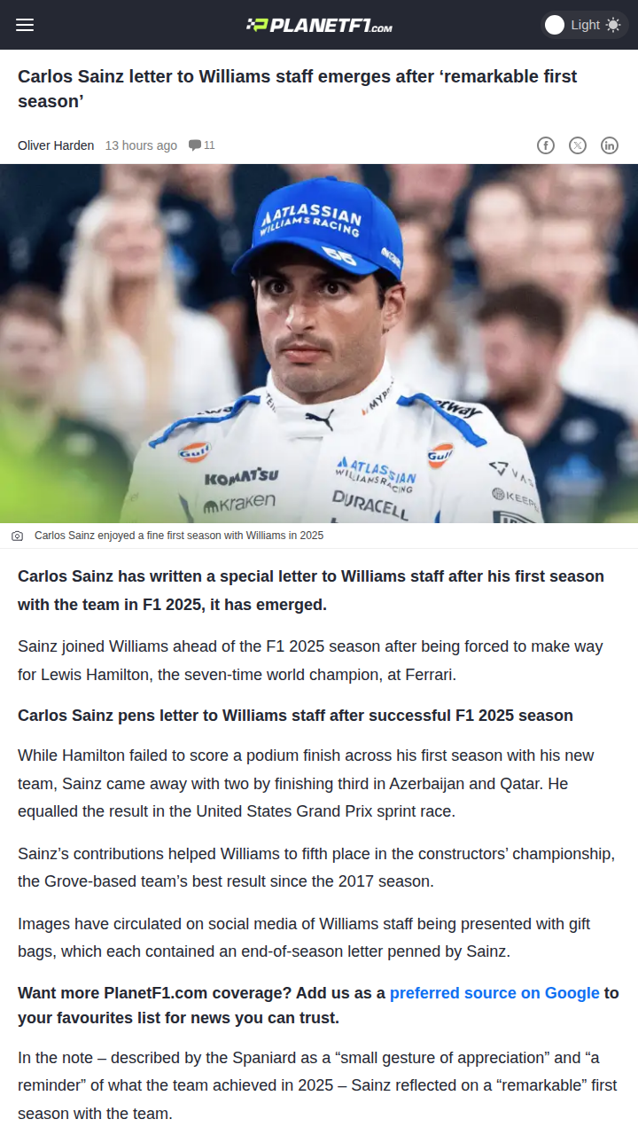 Roger Franco+FollowSainz’s Heartfelt Letter Unites WilliamsSmooth Operator fans, did you catch Carlos Sainz’s classy move after his first season with Williams? Not only did he help the Grove squad clinch their best constructors’ finish since 2017, but he also penned a personal letter to every staff member, thanking them for the journey and reminding everyone the ultimate goal—winning—is still ahead. After being edged out by King Lewis at Ferrari, Sainz is proving he’s more than just fast on track—he’s a true team player. Thoughts on his impact at Williams so far? #Sports #Racing #F100Share