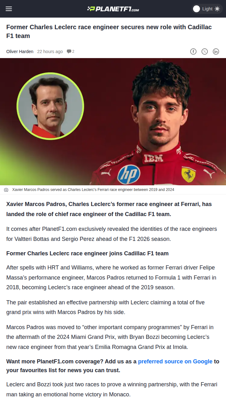 Victor Mathews+FollowLeclerc’s Ex-Engineer Joins Cadillac F1!Big news in the F1 paddock—Xavier Marcos Padros, the man who helped “Il Predestinato” Leclerc to five GP wins, is now Cadillac F1’s chief race engineer! After his Ferrari stint, Marcos Padros is set to shape Cadillac’s debut in 2026. With Cadillac bringing in top talent and Checo already testing at Imola, could we see a new rivalry brewing? Thoughts on how this move will shake up the grid? #Sports #Racing #F100Share