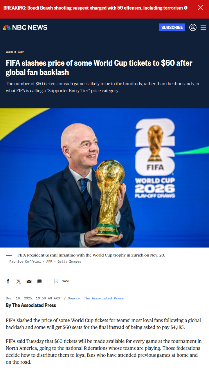 Timothy Thompson+FollowFIFA Ticket U-Turn: $60 Seats for Loyal FansDid anyone see FIFA’s huge climbdown on World Cup ticket prices? After global outrage, they’re now offering a limited batch of $60 seats for the final—down from a jaw-dropping $4,185! The catch? Only the most dedicated supporters, those who’ve followed their teams everywhere, get a shot. It’s a win for the real diehards, but with just a few hundred tickets per match, it’s still going to be a scramble. Thoughts on how federations will pick who gets in? #Sports #Soccer #FIFA10Share