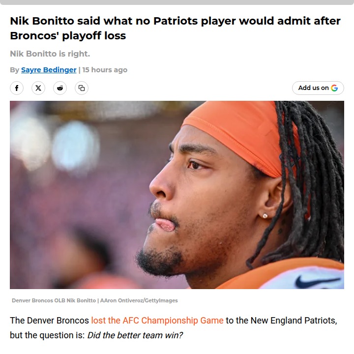 Chad Williams+FollowPatriots vs Broncos: Was the Better Team Robbed?Nik Bonitto didn’t hold back after the Broncos’ gut-wrenching 10-7 loss to the Patriots in the AFC Championship. The Broncos’ star pass rusher called the defeat “sickening,” insisting Denver was the better squad—even with Bo Nix and key playmakers sidelined. With controversial calls and missed chances, it felt like the Broncos lost more than the Pats won. Patriots fans will say “scoreboard,” but Bonitto’s words echo what many Broncos faithful are thinking. #Sports #Football #PatriotsVsBroncos00Share