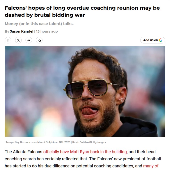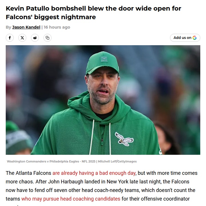 Chad Williams+FollowPatullo Shakeup: Falcons' Coaching Nightmare?Birds fans, buckle up—Kevin Patullo’s uncertain status with the Eagles just turned up the heat on the Falcons’ coaching search. With Dirty Birds already sweating over Harbaugh’s Big Apple visit, now Philly’s looking to poach top head coach candidates for their OC gig. If the Eagles swing big and land a name like Stefanski or McDaniel, Atlanta’s rebuild could get even messier. Could this rivalry in the coaching market decide the NFC’s next powerhouse? #Sports #Football #Falcons00Share