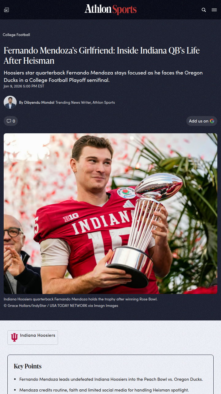 glen25+FollowHow Fernando Mendoza stays focused after HeismanFernando Mendoza’s life hasn’t turned into a Hollywood script since winning the Heisman—he’s still all about football and keeping things simple. Instead of getting swept up in the hype, Mendoza credits his faith, daily routine, and a near-total social media blackout for keeping him grounded. He only uses LinkedIn and YouTube, tuning out both the praise and the criticism. This approach seems to be working: Indiana is undefeated and heading into the Peach Bowl with a shot at the national title. What do you think—can staying offline really help athletes perform at their best? #Sports #Football #FernandoMendoza10Share