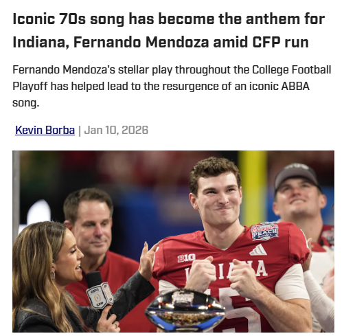 Connie Wilson+FollowABBA’s ‘Fernando’ becomes Indiana’s anthemIndiana Hoosiers fans have turned ABBA’s 70s classic “Fernando” into the unofficial anthem of their College Football Playoff run, all thanks to quarterback Fernando Mendoza’s standout season. It’s wild seeing TikTok flooded with highlights of Mendoza set to those iconic lyrics, and even he admits it started as an inside joke with friends. Now, it’s a rallying cry for the whole IU community. With the Hoosiers headed to Miami for the championship, Mendoza’s story comes full circle—playing for a title in his hometown, just blocks from where he grew up. Who else is loving this blend of sports and pop culture? #Entertainment #IndianaHoosiers #FernandoMendoza00Share