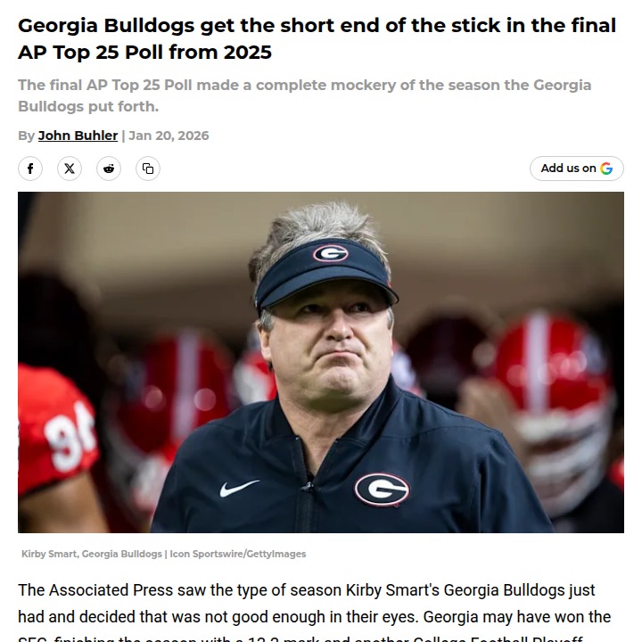 Amy Williams+FollowGeorgia Bulldogs snubbed in AP Top 25Georgia fans, this one stings: after a 12-2 season, an SEC title, and a Sugar Bowl run, the Bulldogs landed just No. 6 in the final AP Top 25 poll for 2025. Indiana and Miami at the top make sense, but seeing Oregon and Ohio State ahead of Georgia is a head-scratcher—especially since the Dawgs avenged their only regular-season loss and won their conference. Does this ranking feel fair to you, or did the AP voters miss the mark? Let’s hear your take on where Georgia really belongs! #Sports #Football #GeorgiaBulldogs00Share