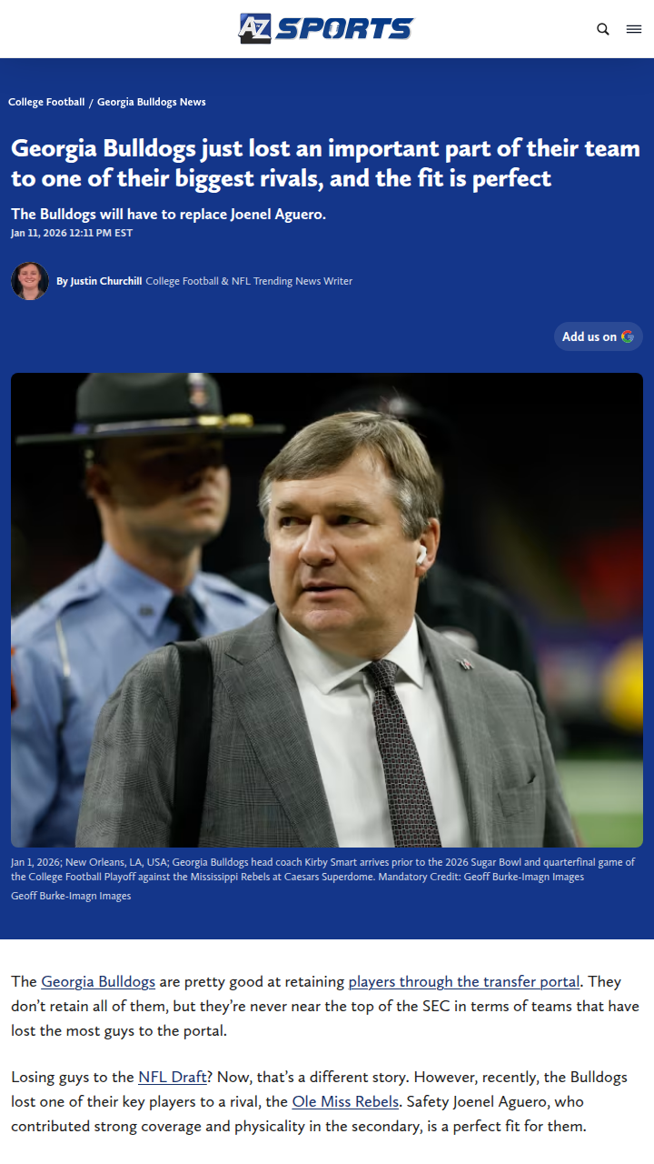 Chad Williams+FollowGeorgia Bulldogs lose key player to Ole MissLosing Joenel Aguero to Ole Miss is a gut punch for Georgia fans, especially after the Sugar Bowl loss. Aguero’s versatility and toughness in the secondary made him a difference-maker for the Bulldogs, and now he’s set to fill a major need for the Rebels. With 72 tackles and a knack for big plays, Aguero brings experience and a winning mentality to Oxford. This move feels like a perfect fit for him, but it leaves Georgia with a big hole to fill. How do you think this transfer will shake up the SEC next season? #Sports #Football #GeorgiaBulldogs00Share