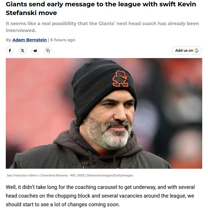 Aaron Taylor+FollowBig Blue Moves Fast on Stefanski HireThe G-Men wasted no time making a statement, bringing in Kevin Stefanski for an interview just hours after his Browns exit. With the coaching carousel spinning, it’s clear Joe Schoen has had his eye on Stefanski for a while. If Stefanski lands the job, it could mean a fresh culture for Big Blue and a huge boost for Jaxson Dart’s development. Is this the bold move the Giants need to get back on track? Let’s hear your takes! #Sports #Football #GiantsNation7117Share