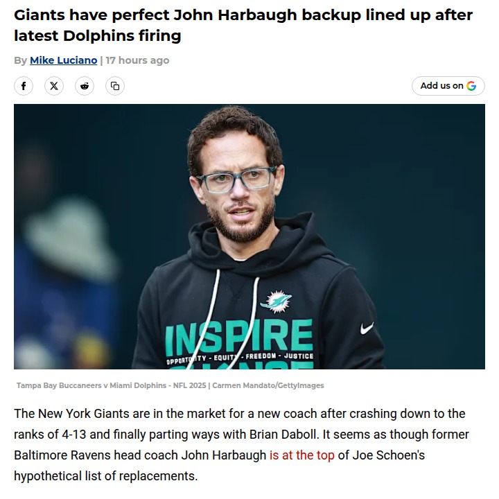 phughes+FollowGiants Eye McDaniel as Harbaugh Backup?Big Blue fans, what do you think about the latest coaching buzz? With John Harbaugh reportedly the top target, the Giants are also keeping tabs on Mike McDaniel after his Dolphins exit. While Harbaugh’s pedigree is obvious, McDaniel’s offensive mind could be just what Jaxson Dart needs to level up. If Harbaugh passes, is McDaniel the right move to revive the G-Men? Let’s hear your takes! #Sports #Football #GiantsNation10Share