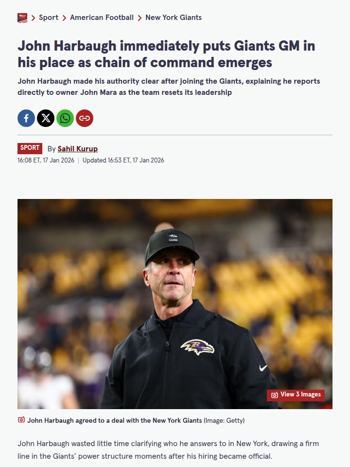 Jay Williams+FollowHarbaugh Sets Giants Chain of Command StraightBig Blue fans, the power dynamic in New York just got real. John Harbaugh, fresh off his Ravens run, made it crystal clear: he reports to John Mara, not GM Joe Schoen. After some contract language drama, Harbaugh’s message leaves no doubt—ownership calls the shots. Looks like the Giants’ new era starts with a strong chain of command. Thoughts on how this will shape the Schoen-Harbaugh partnership? #Sports #Football #GiantsNation20Share