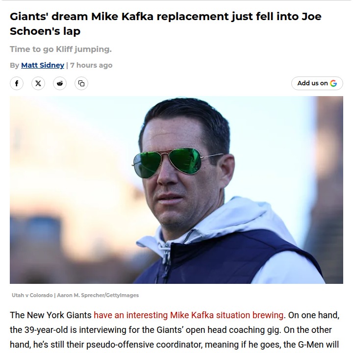 Michael Pitts+FollowKliff Kingsbury: Big Blue’s Secret Weapon?With Mike Kafka possibly out the door, the G-Men have a golden chance to snag Kliff Kingsbury as OC. Kingsbury’s track record with mobile QBs (think Kyler and Daniels) could be just what Jaxson Dart needs to take the next step. Plus, his inside scoop on the Commanders could give Big Blue an edge in those NFC East showdowns. If Joe Schoen wants to shake things up, this is the move! #Sports #Football #GiantsNation10Share