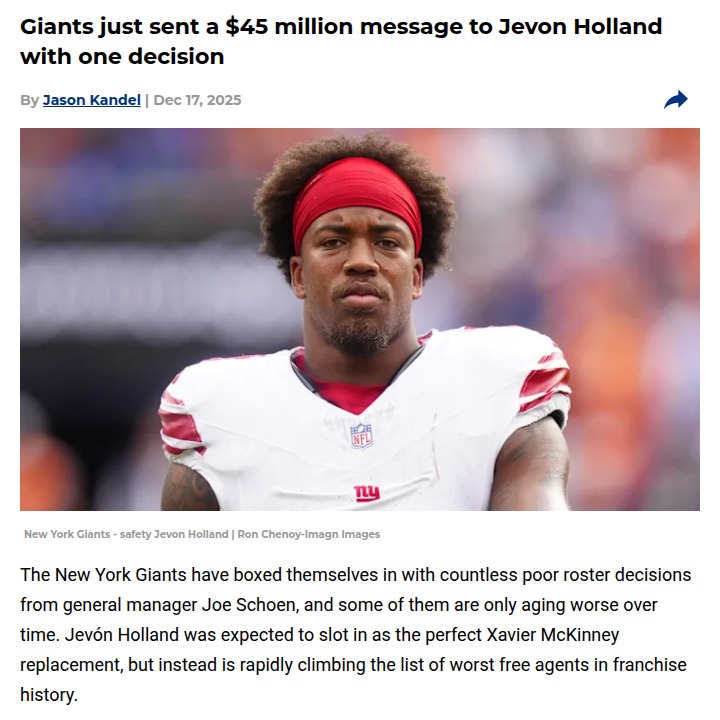 Christopher Hughes+FollowGiants’ $45M Gamble: Holland’s Special Teams SagaBig Blue fans, what do you make of the Jevón Holland experiment? After shelling out $45 million, the Giants are now using the former Oregon standout as a return man—clearly not what anyone expected from McKinney’s replacement. Interim coach Kafka says it’s about trust, but with Holland’s struggles and the Commanders loss, this move feels more like desperation than strategy. Is this the worst free agent signing in recent Giants memory, or is there still hope for a turnaround? #Sports #Football #GiantsNation00Share