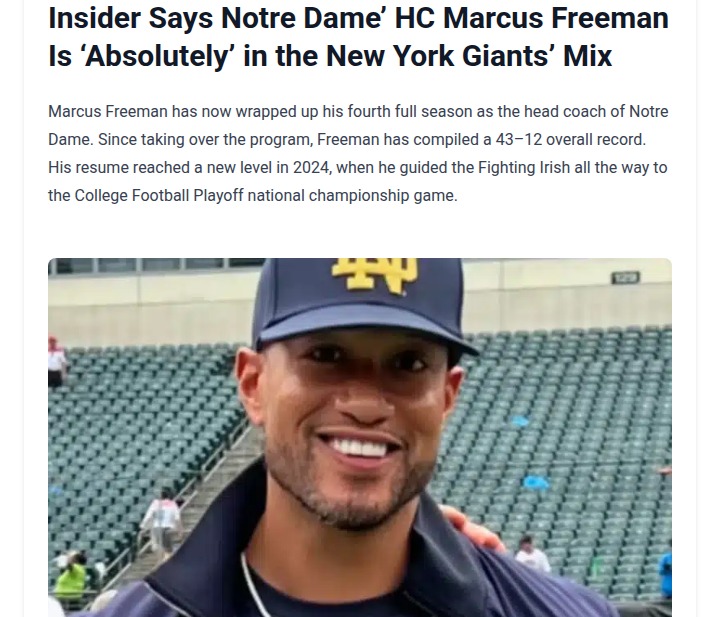glen25+FollowFreeman in Big Blue’s Crosshairs?Looks like the G-Men are eyeing Notre Dame’s Marcus Freeman as a top contender for their next head coach. After taking the Fighting Irish to the national title game and racking up a 43–12 record, Freeman’s stock is sky-high. NFL insiders say he’s at the top of the Giants’ wish list, especially with no clear offensive mastermind available this cycle. Could we see Freeman trading in the gold and blue for Big Blue? #Sports #Football #GiantsNation00Share