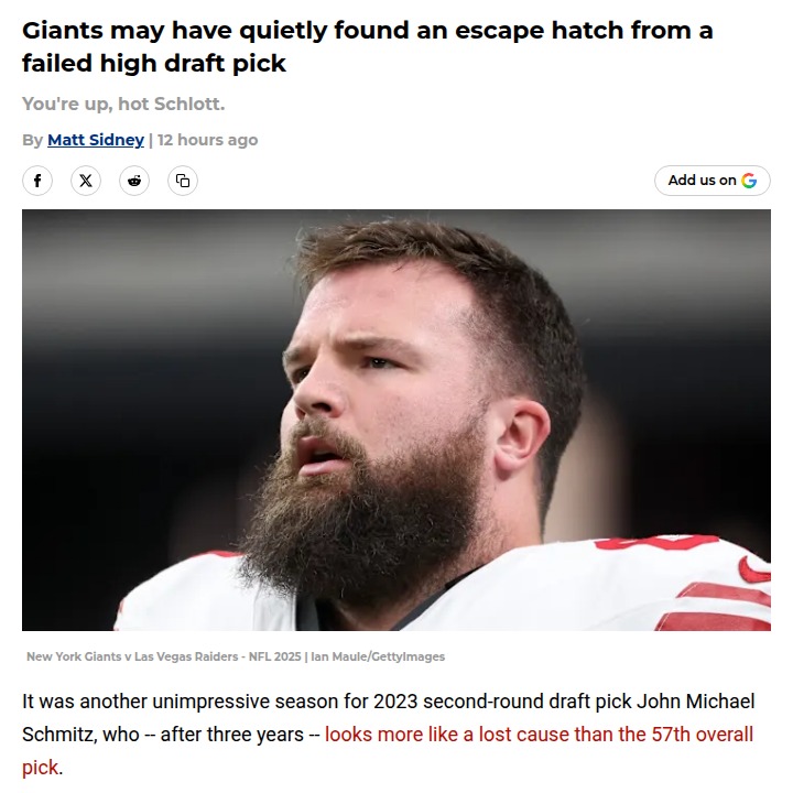Aaron Taylor+FollowBig Blue’s Center Dilemma: Is Schlotty the Answer?Fellow G-Men fans, it looks like the John Michael Schmitz experiment might be winding down. After three seasons of underwhelming play, the Giants have a golden opportunity to move on—thanks to Austin “Schlotty” Schlottmann’s solid fill-in work last year. With Harbaugh now calling the shots, don’t be surprised if business comes before loyalty and Schlotty gets the nod at center. Could this be the end of the JMS era? #Sports #Football #GiantsNation00Share