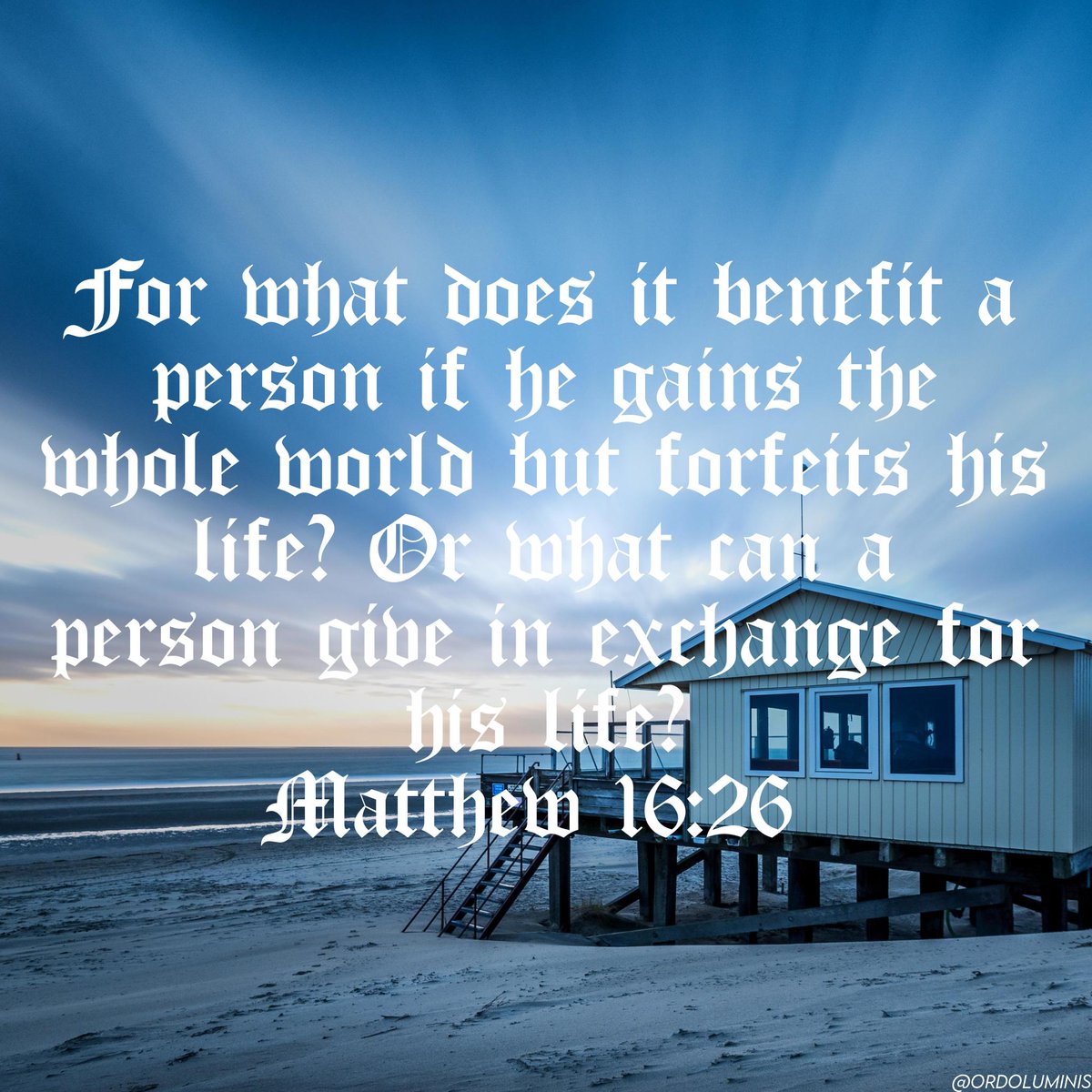 OpalOracle+Follow"For what does it benefit a person if he gains the whole world but forfeits his life? Or what can a person give in exchange for his life?" — Matthew 16:26 NET #Jesus #God #Bible10Share