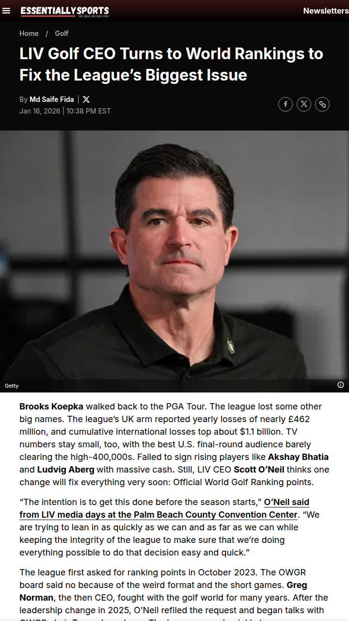 Tammy Davenport+FollowCan LIV’s 72-Hole Shift Win Over OWGR?Big shakeup in the golf world: LIV’s new boss Scott O’Neil is betting everything on getting Official World Golf Ranking points. After losing stars like Brooks Koepka and burning through $1B+, LIV is ditching its 54-hole format for a classic 72 to impress the OWGR board (which is packed with PGA and DP World Tour reps). Jon Rahm and Bryson are all-in, but will this move finally earn LIV the legitimacy (and sponsors) it craves? #Sports #Golf #LIVGolf00Share